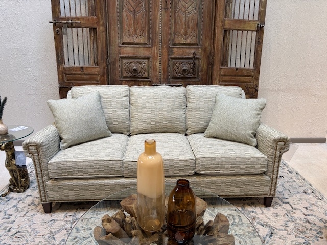The 211 Transitional Key Arm Sofa with Nailheads, made by Smith Brothers,